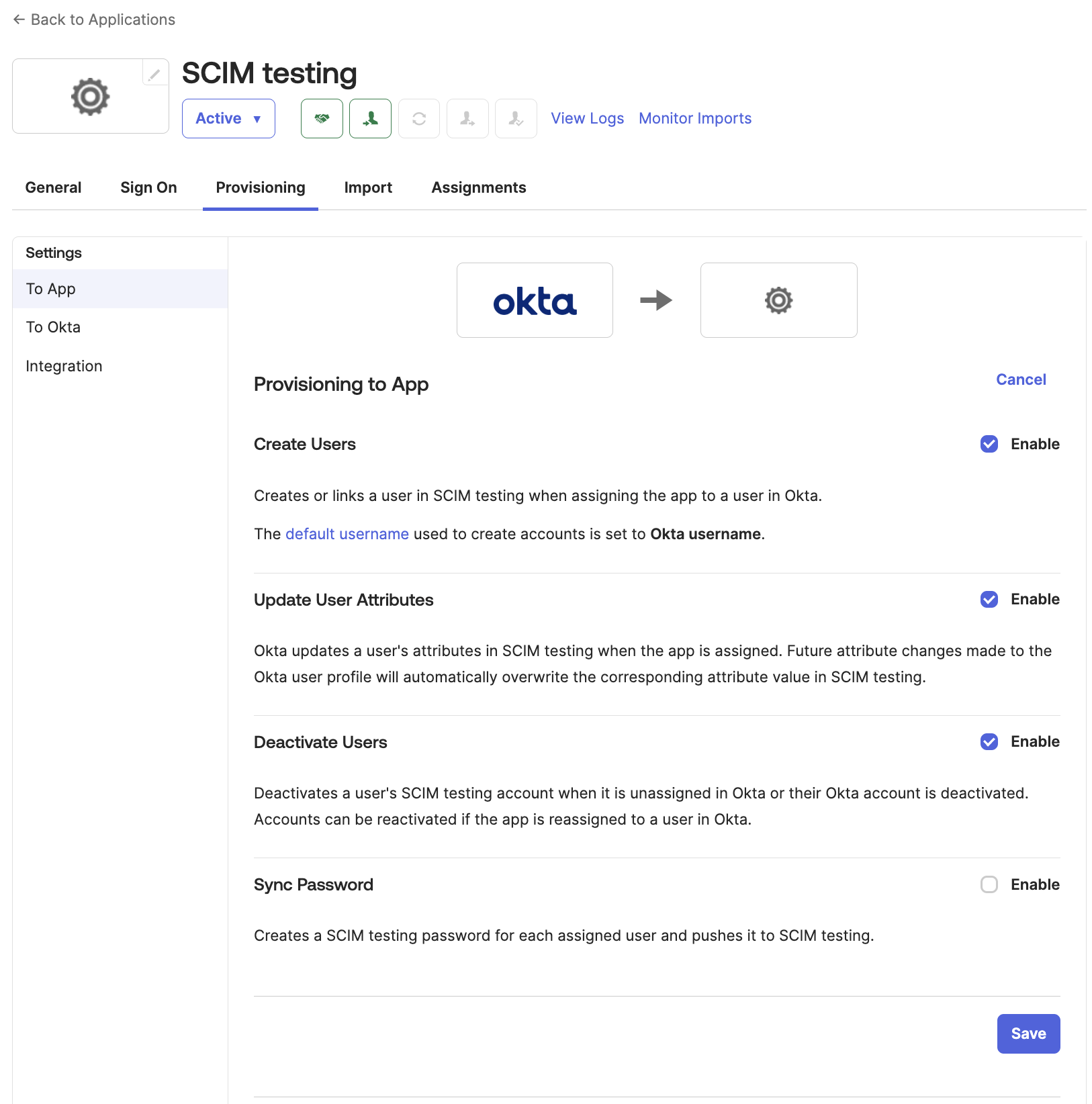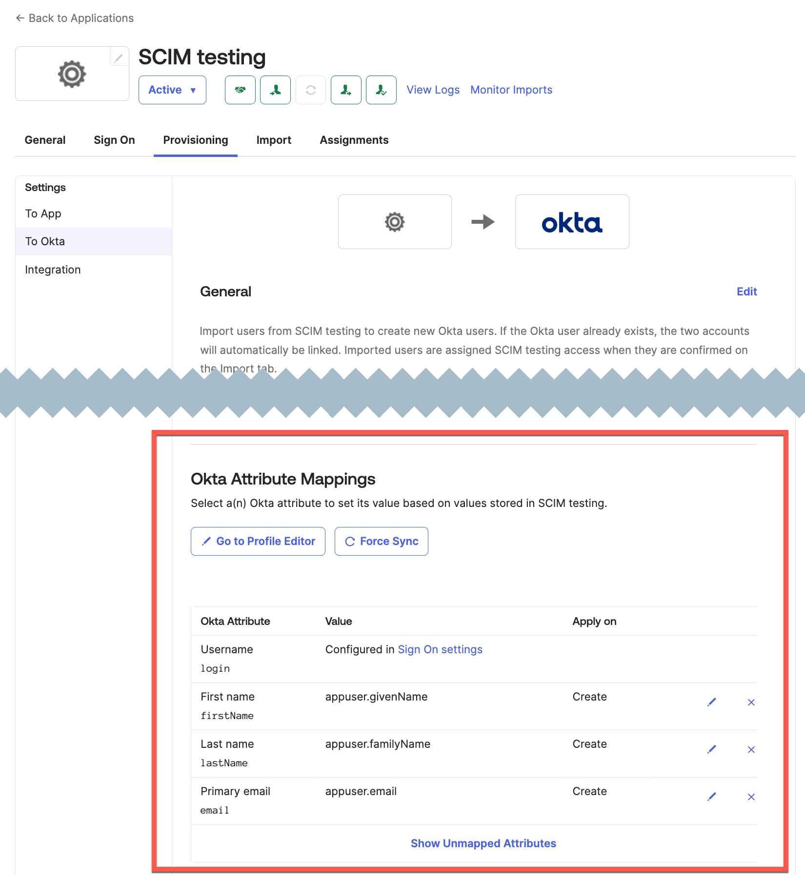 - Edit attributes that will be pushed from the provisioning app to Okta.