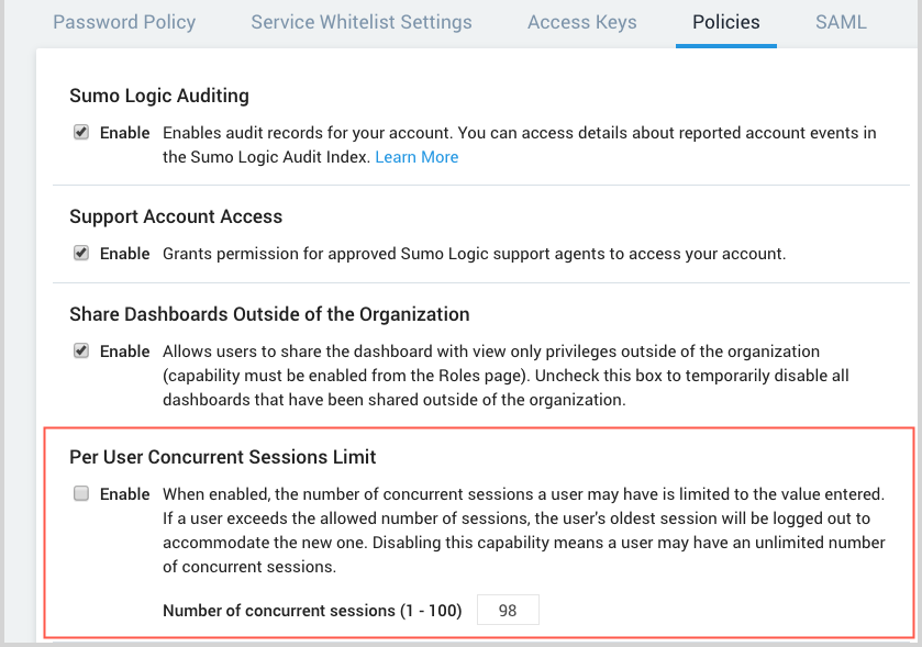 Classic UI. In the main Sumo Logic menu, select Administration > Security > Policies. - Click the checkbox in the Per User Concurrent Sessions Limit section.