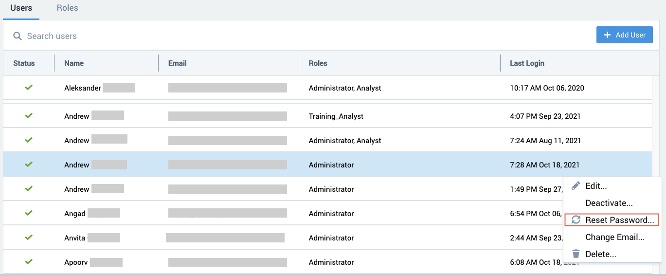 - Select the row for the user whose password you want to reset and choose Reset Password from the three-dot kebab options menu.