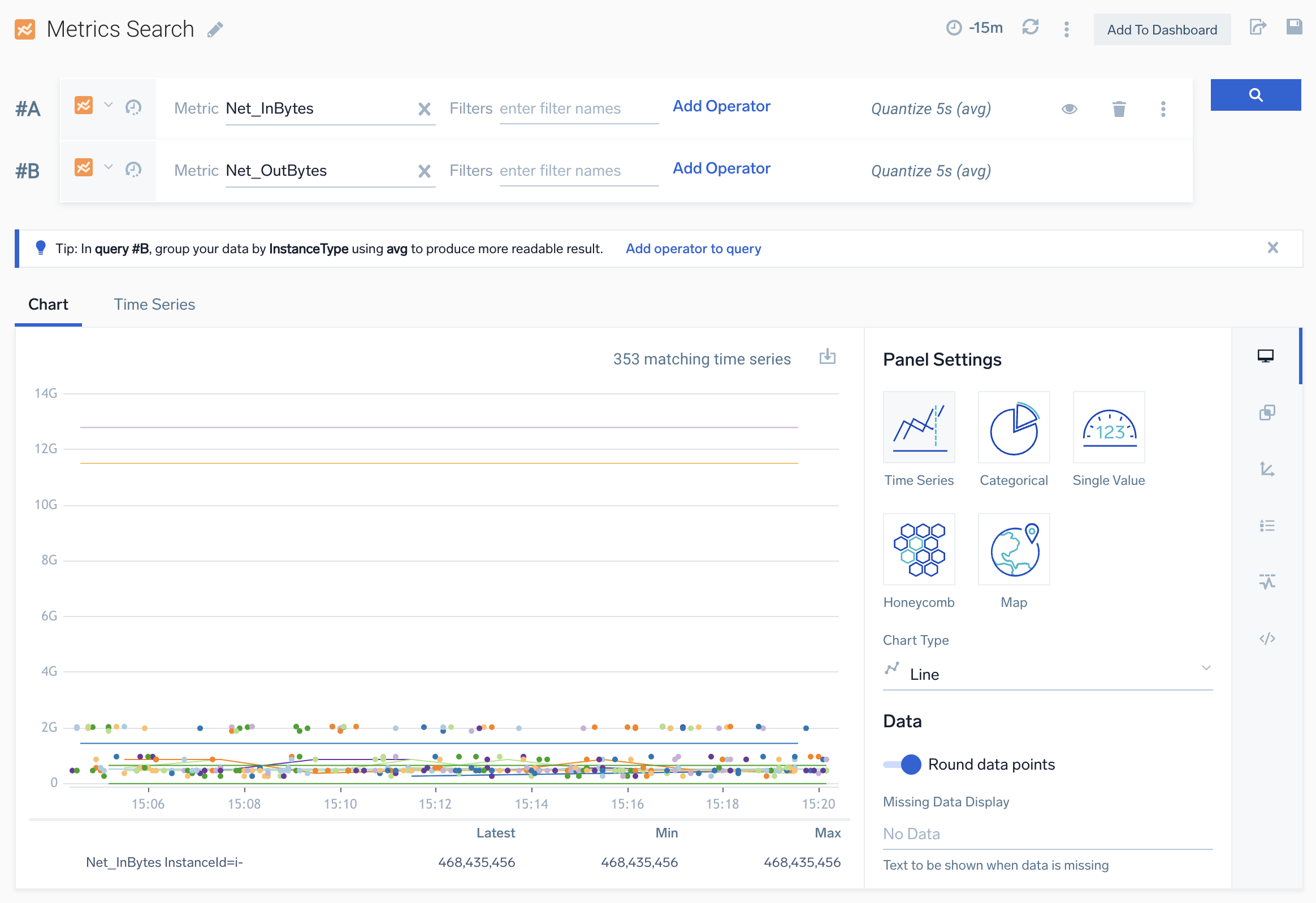 You can use metric operators of various sorts to process the metric data that matches your selectors. For example, you can use aggregation operators like avg, max, min, sum, and count; statistical operators like pct and rate; and select time series that have the highest or lowest values of a particular metric using topk and bottomk.