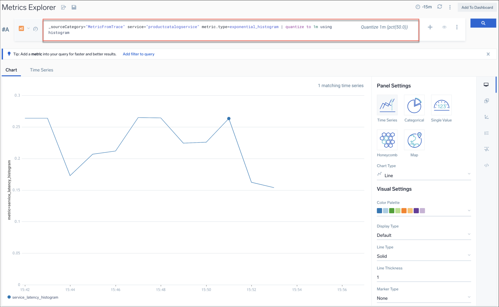 _sourceCategory="MetricFromTrace" service="productcatalogservice" metric.type=exponential_histogram | quantize to 1m using histogram