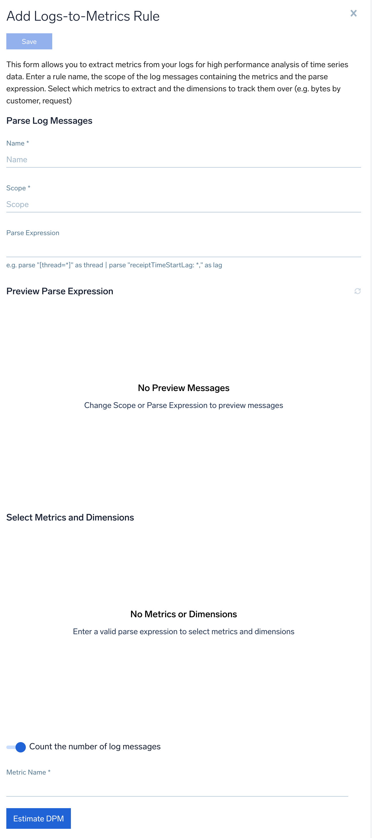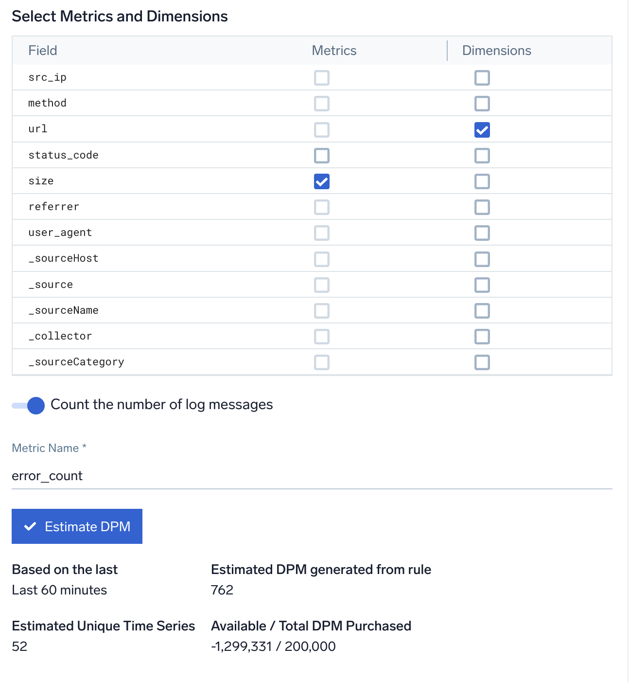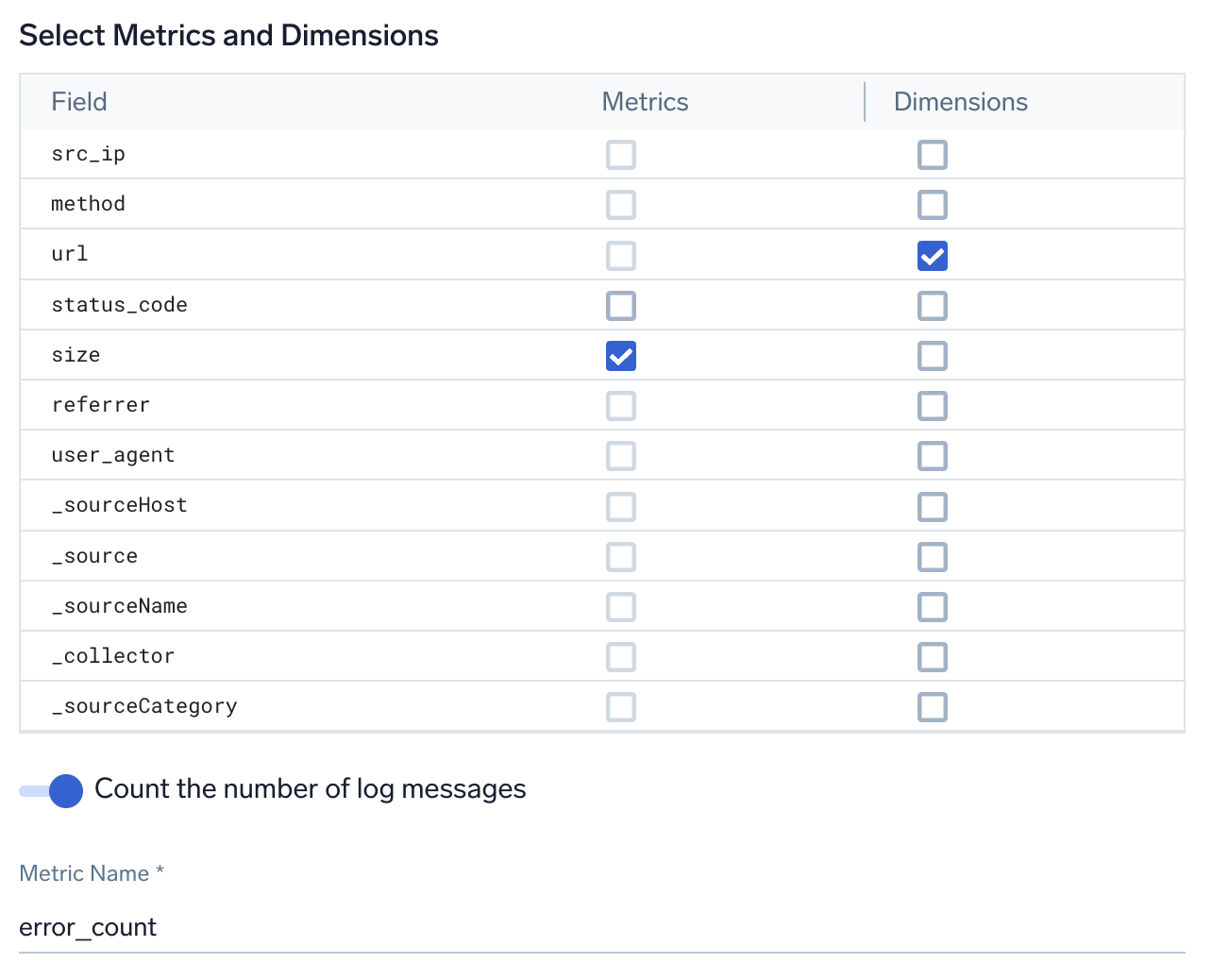 hostId. Configuring fields as dimensions is optional. Avoid selecting too many dimensions, as that will increase the number of unique metrics produced from the rule. - Toggle the Count the number of log messages switch on if you want to create a metric that is the total number of log messages that match your scope and parse expression. You can create a calculated metric like this in addition to designating one or more fields as metrics. If you toggle this switch, the page prompts you to enter a name for the metric. When you query a metric that is a count of messages, when you query that metric, you must include a