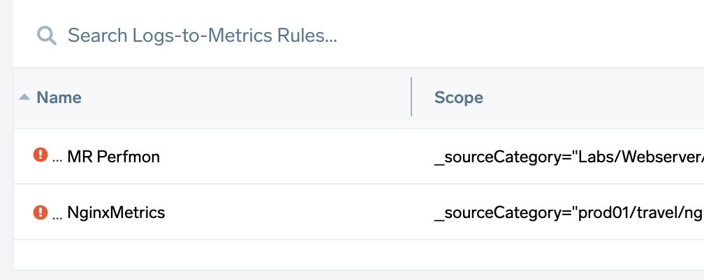If, over time, the volume of unique time series returned by a Logs-to-Metrics rule grows to more than 30,000, Sumo will disable the rule. You can see that a rule is disabled on the Logs-to-Metrics page: a red icon appears to the left of the rule name.