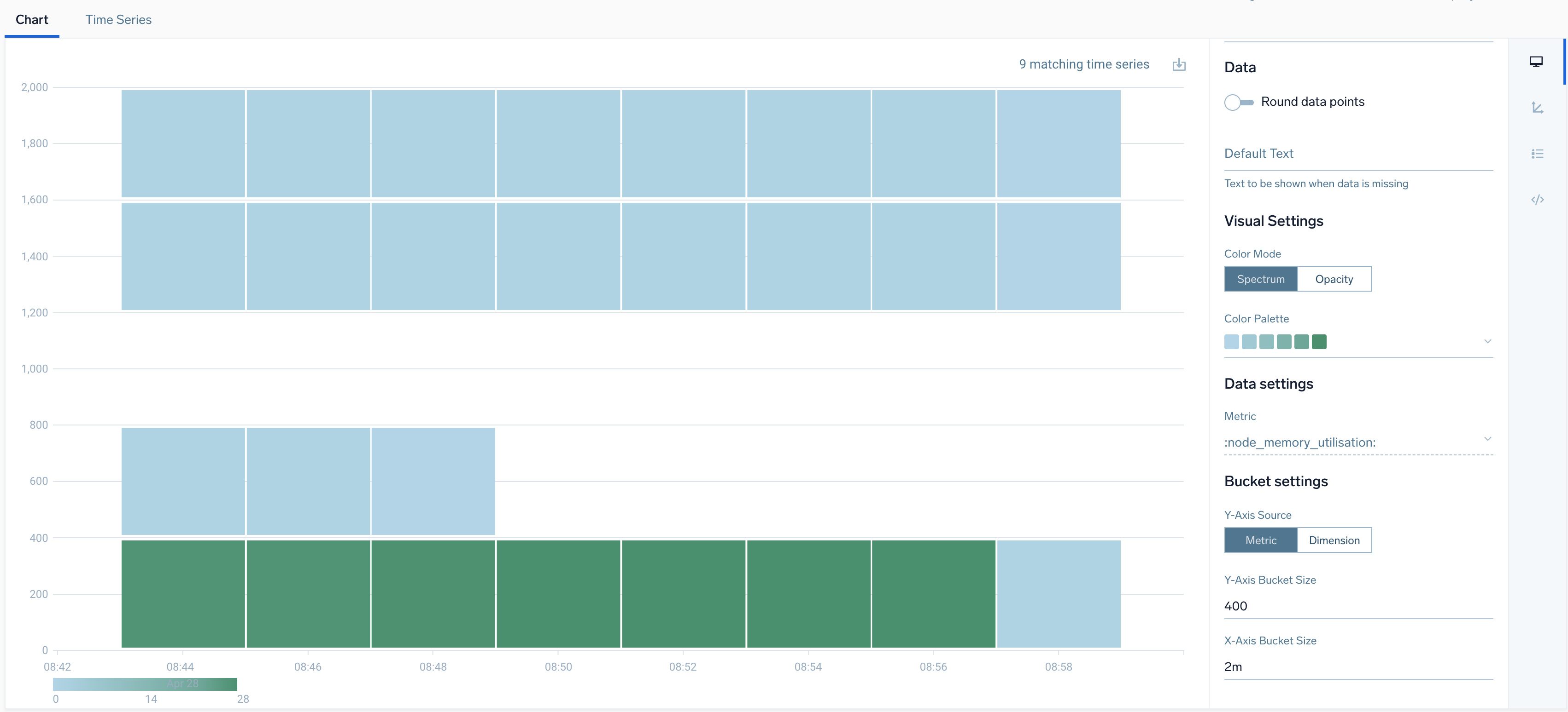 Each rectangle shown on a heap chart corresponds to a set of data points. As noted above, the location of a rectangle within the heat map indicates the time range and value range of its underlying data points. By default, the color of a rectangle indicates the volume of data points in the time range. You can choose from multiple color palettes. The more intense the color within the palette, the more data points it represents. You can hover over a rectangle to see the count of data points and the value range. If desired, you can represent the data point count by varying levels of opacity of a selected color, rather than by intensity across a selected color palette.
