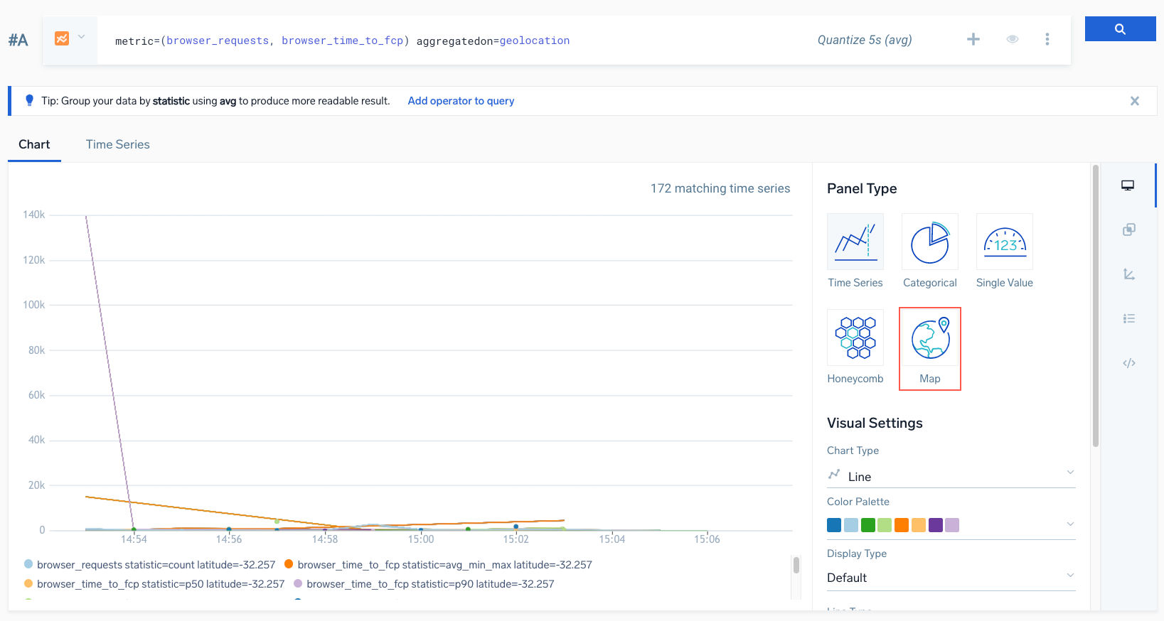 Map visualizations are supported in the Metrics Search and dashboard panel builder.