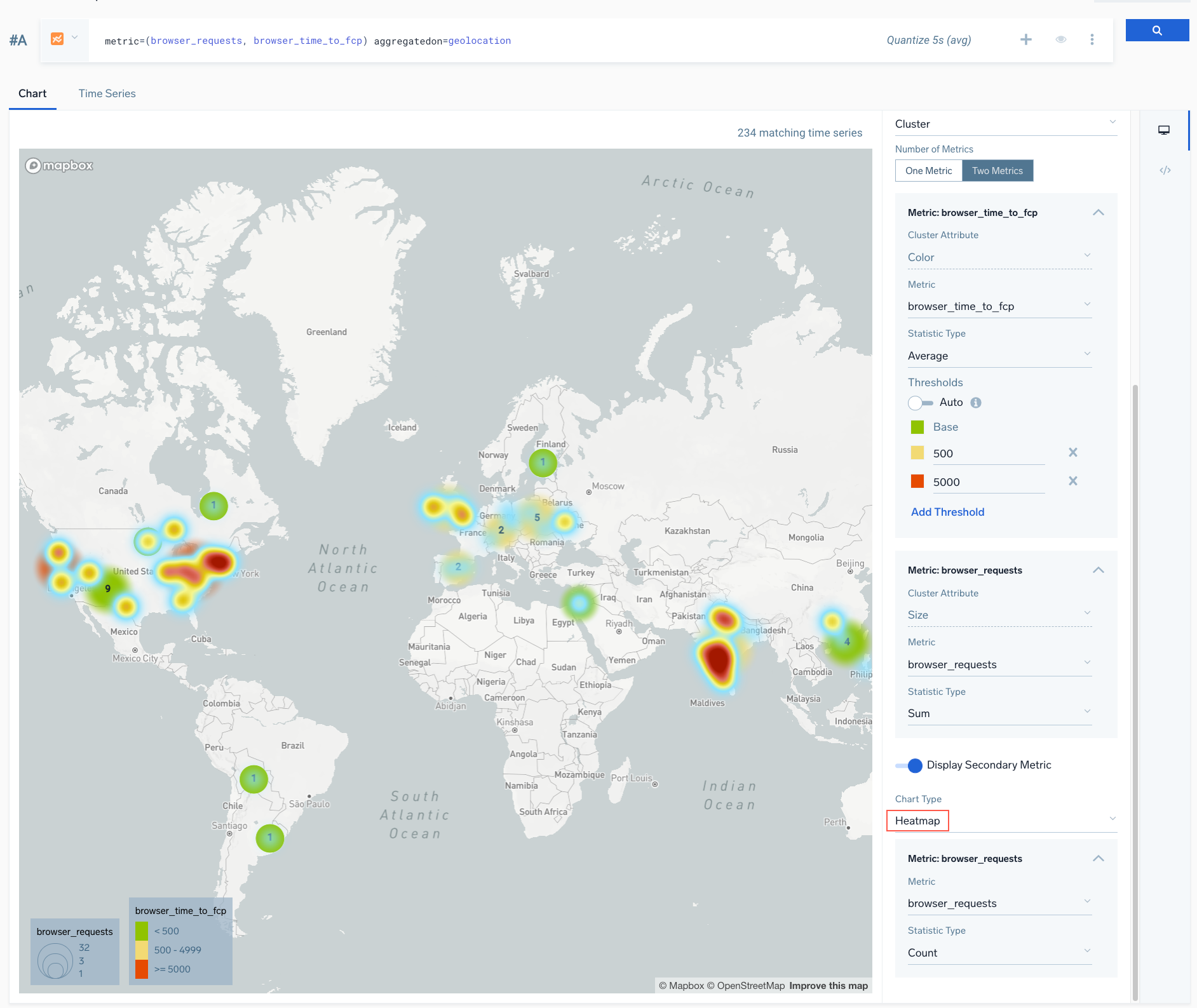 If your metrics query returns two metrics, choosing the Display Secondary Metric option will result in both metrics being visualized on the chart. Note that when you choose this option, you can set a different chart type for each of the metrics–one can be cluster and the other a heatmap, as shown in the screenshot below.