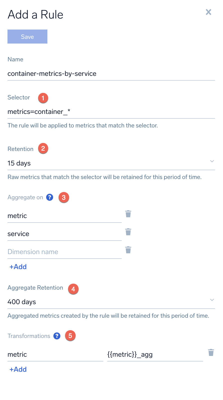 - Transformations. (Optional) If you want to add a new dimension, or transform a dimension of the aggregated metrics, click +Add: