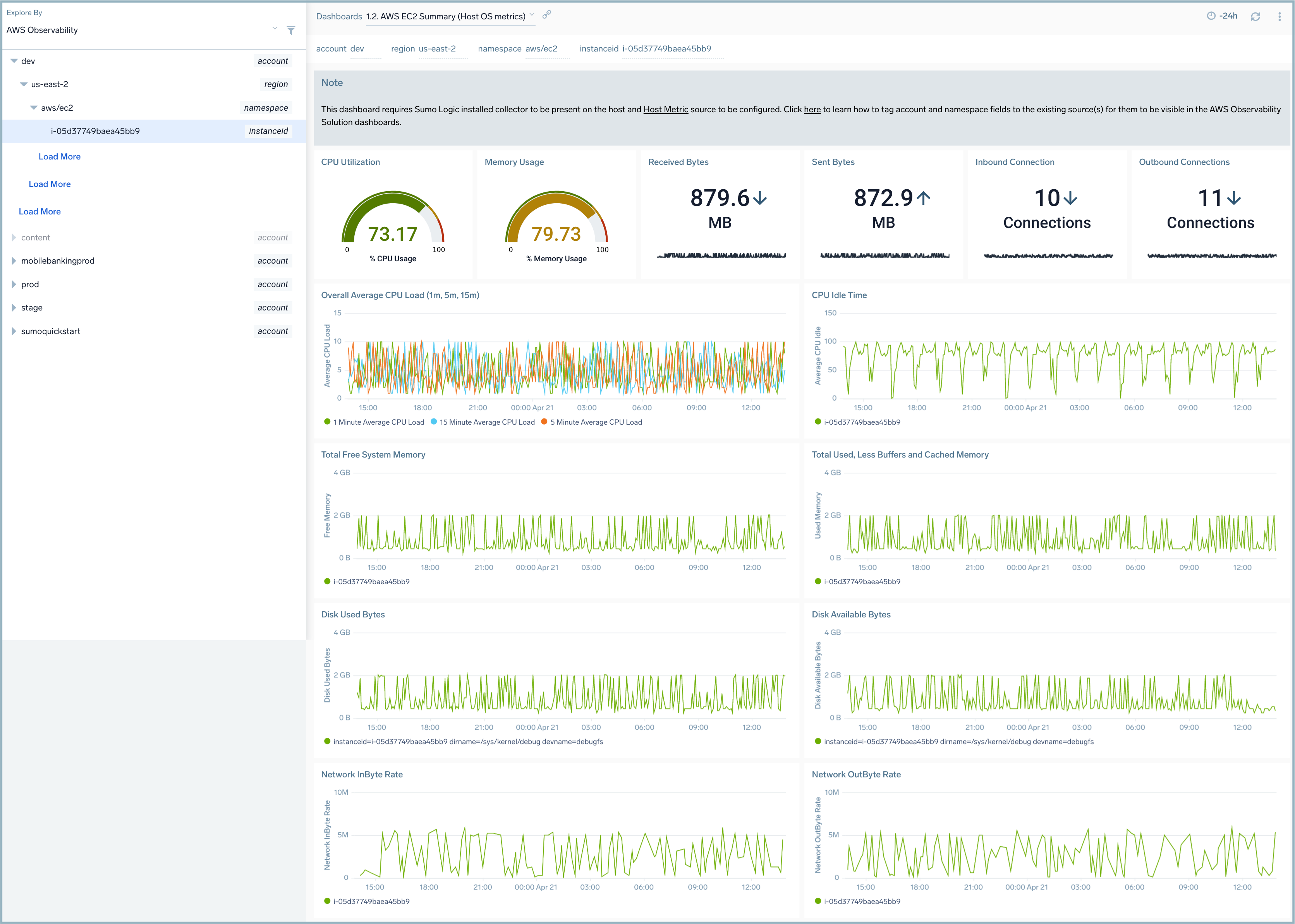 Sumo Logic's AWS Elastic Load Balancing app is a unified logs and metrics app that gives you visibility into the health of your AWS Application Load Balancer and target groups. This app's preconfigured dashboards provide insights into latency, request and host status, threat intel, and HTTP backend codes by availability zone and target group. - AWS Observability Host Metrics (EC2). The Sumo Logic app for AWS Observability Host Metrics (EC2) collects local host metrics and displays them using predefined search queries and dashboards for your Amazon Elastic Compute Cloud (Amazon EC2) service. This app's preconfigured dashboards provide insights into local host metrics for CPU, Disk, Memory, Network, and TCP.