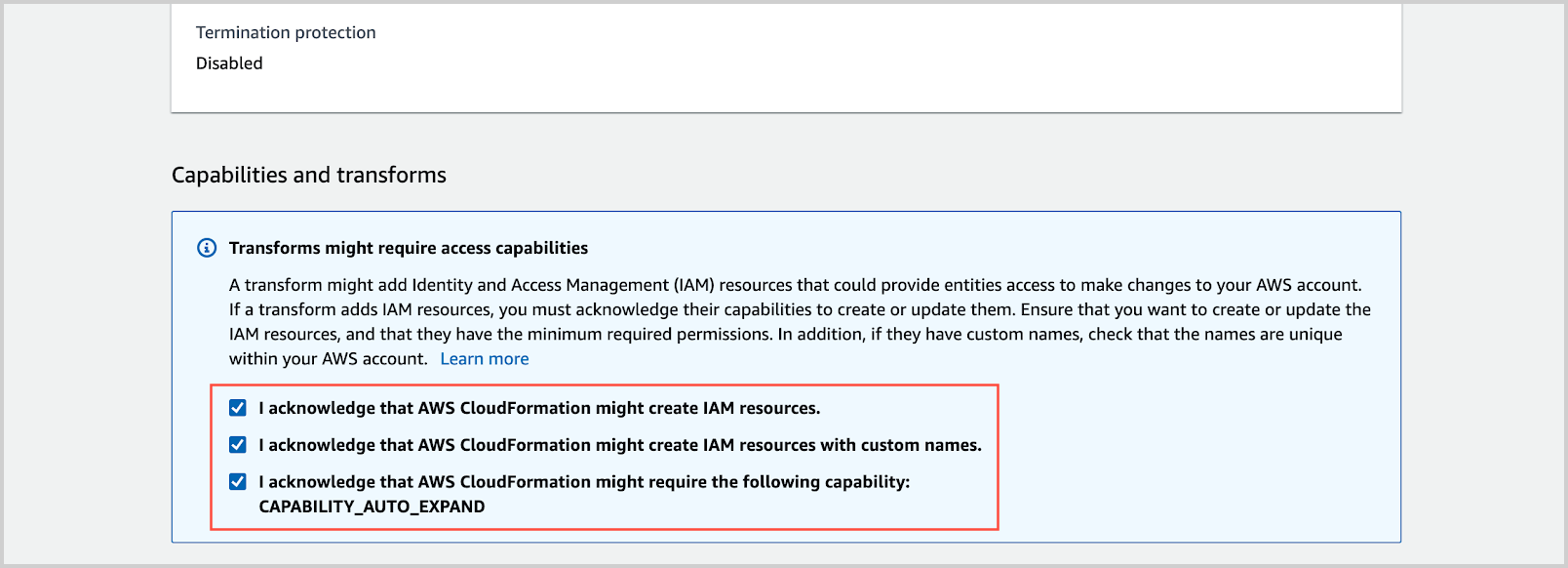 - If the AWS CloudFormation template has not run successfully, identify and fix any permission errors till the stack completes with a CREATE_COMPLETE status. See Troubleshooting for assistance with how to resolve these errors.