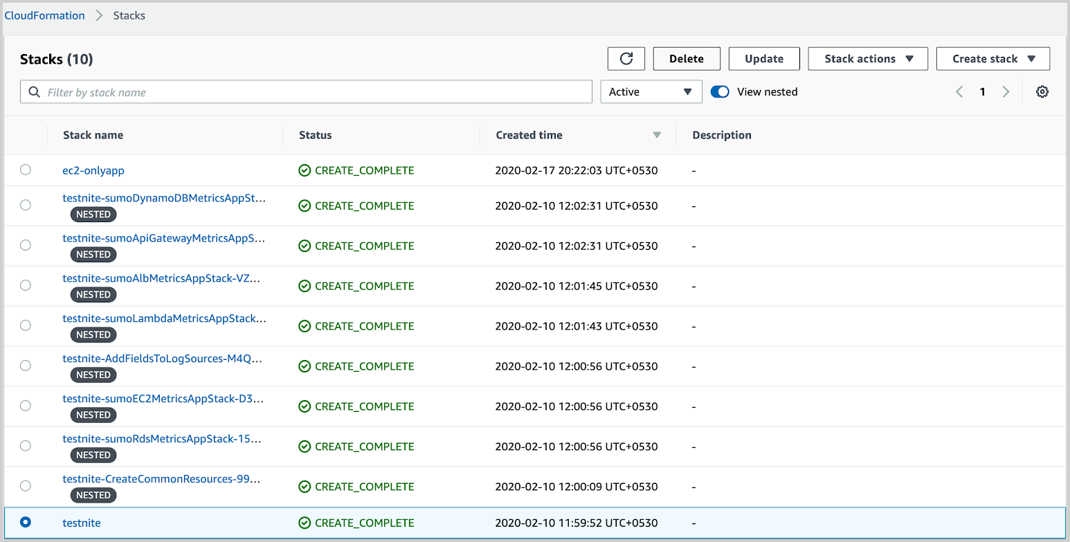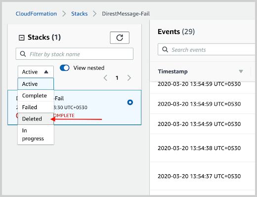 - Select the deleted option to find the nested stacks, as shown in the following example.