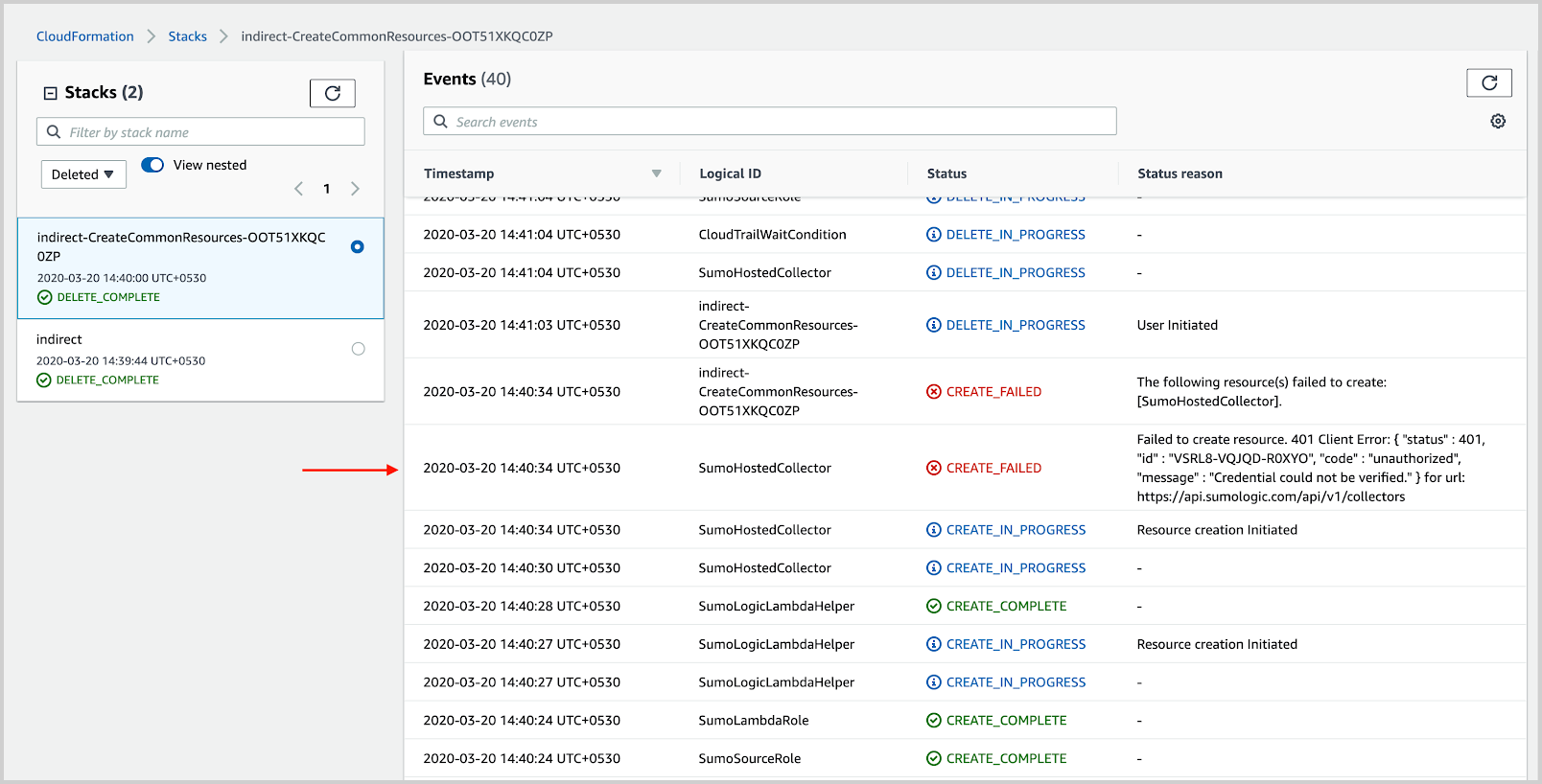 - After the stack rollback is complete and the status is ROLLBACK_COMPLETE, go to the parent stack. In the parent stack, look for the first failure as shown in the following example. The failure can be a direct reason or can point to a nested stack.
