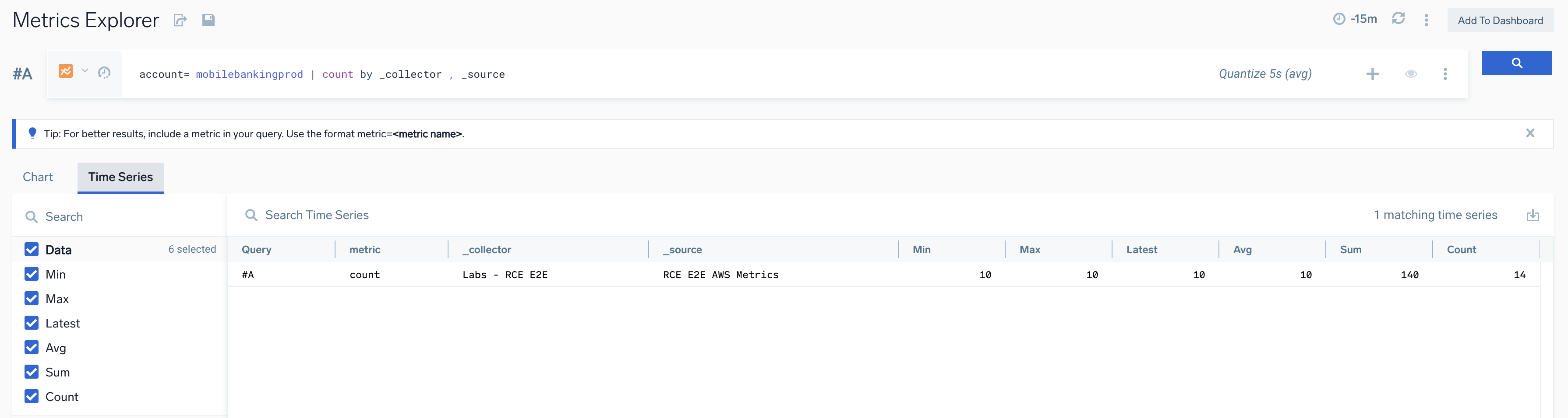 - Run the required metric query to identify from which source and collector data is being ingested. For this example, enter the metric query below: