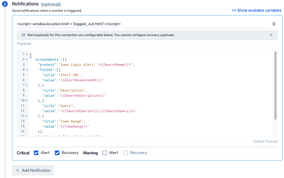 For example, to set up a Slack notification, select Slack from the dropdown menu and edit the Payload as needed. The following information shows the default settings: