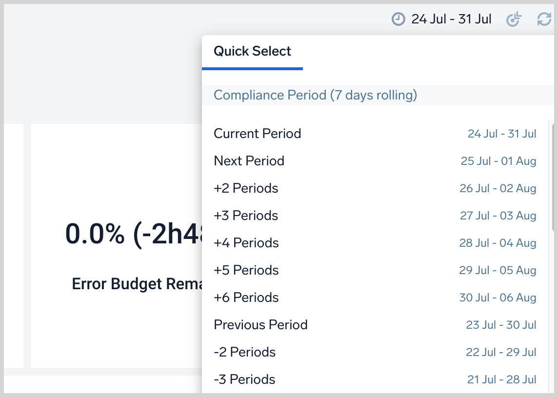 Each SLO comes with a pre-built dashboard that provides an active view into the health and status of your SLO, including the current SLI, the remaining error budget, an error budget burndown chart as well as historical performance of your SLO.