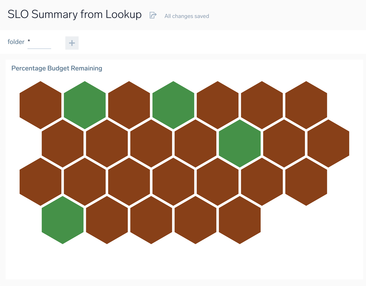 Say you want a high-level overview into the health of your SLOs. A honeycomb visualization on the error budget remaining percentage is a nice way to achieve that.
