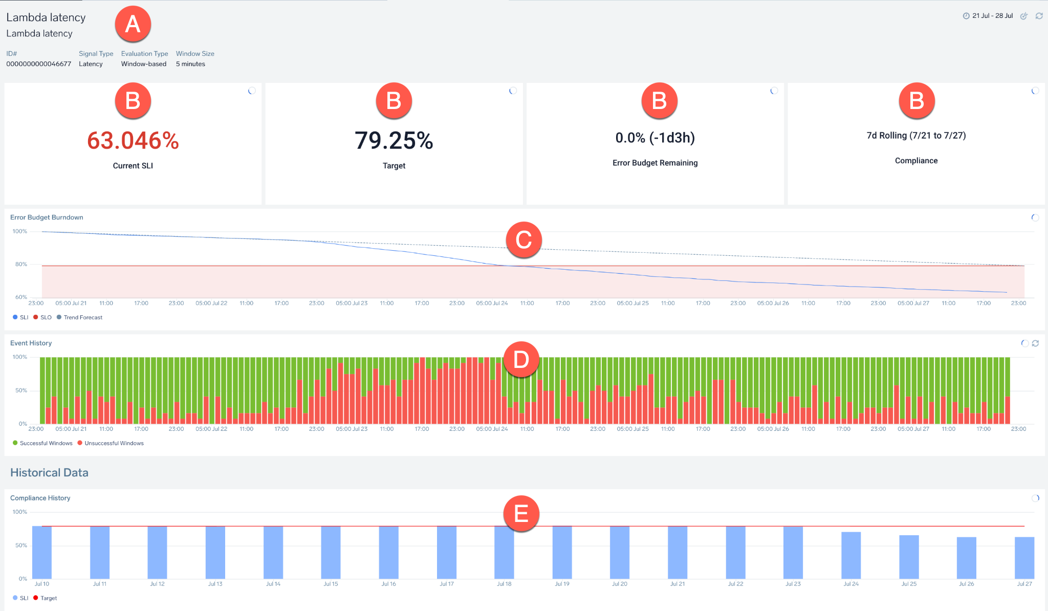| E | Compliance History/Historical Data: Displays SLI and SLO for up to 30 compliance periods. |