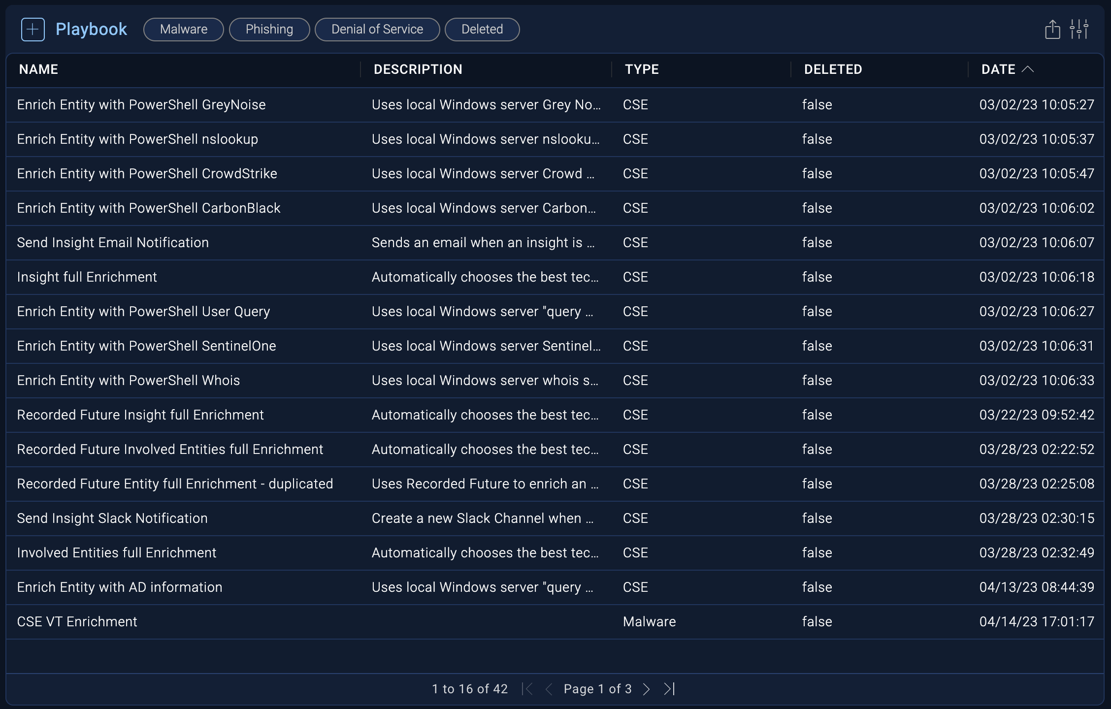 - Playbook. Shows playbooks, which are workflows you can run to perform automations.