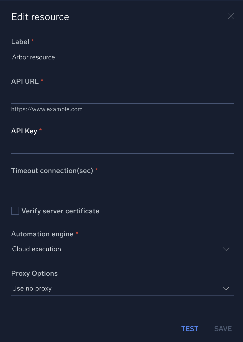 In the configuration dialog, enter information from the product you're integrating with. When done, click TEST to test the configuration, and click SAVE to save the configuration: