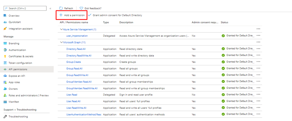 - To configure Azure AD Application permissions, on the left choose API permissions.