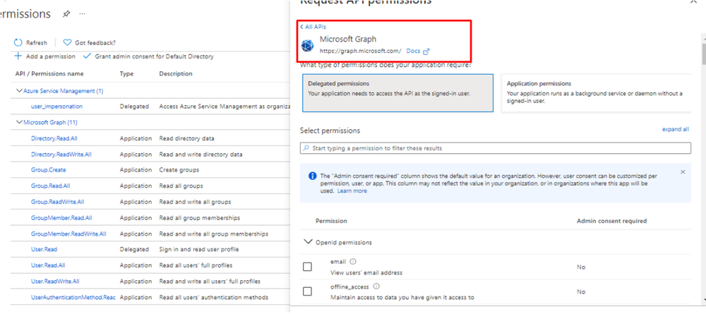 - Delegated permissions are selected by default.