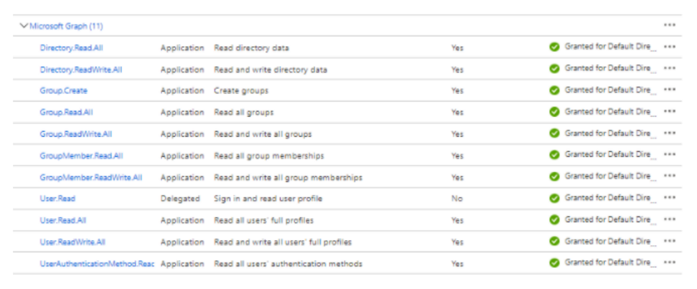 - Application. User.Read.All, User.ReadWrite.All, Directory.Read.All, Directory.ReadWrite.All.