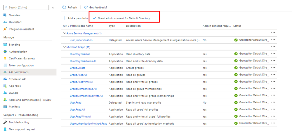 - Once API permission are added then Admin must consent to a grant these permissions (Learn more about permissions and consent.)