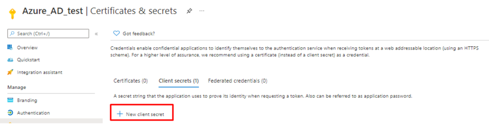 - Once Admin Consent is granted, API permissions configuration have been completed. Then we have to add a Client secret that will be used for the authentication, along with Client ID and Directory ID. To add Client secret, go to Certificates and secrets, and click New client secret.