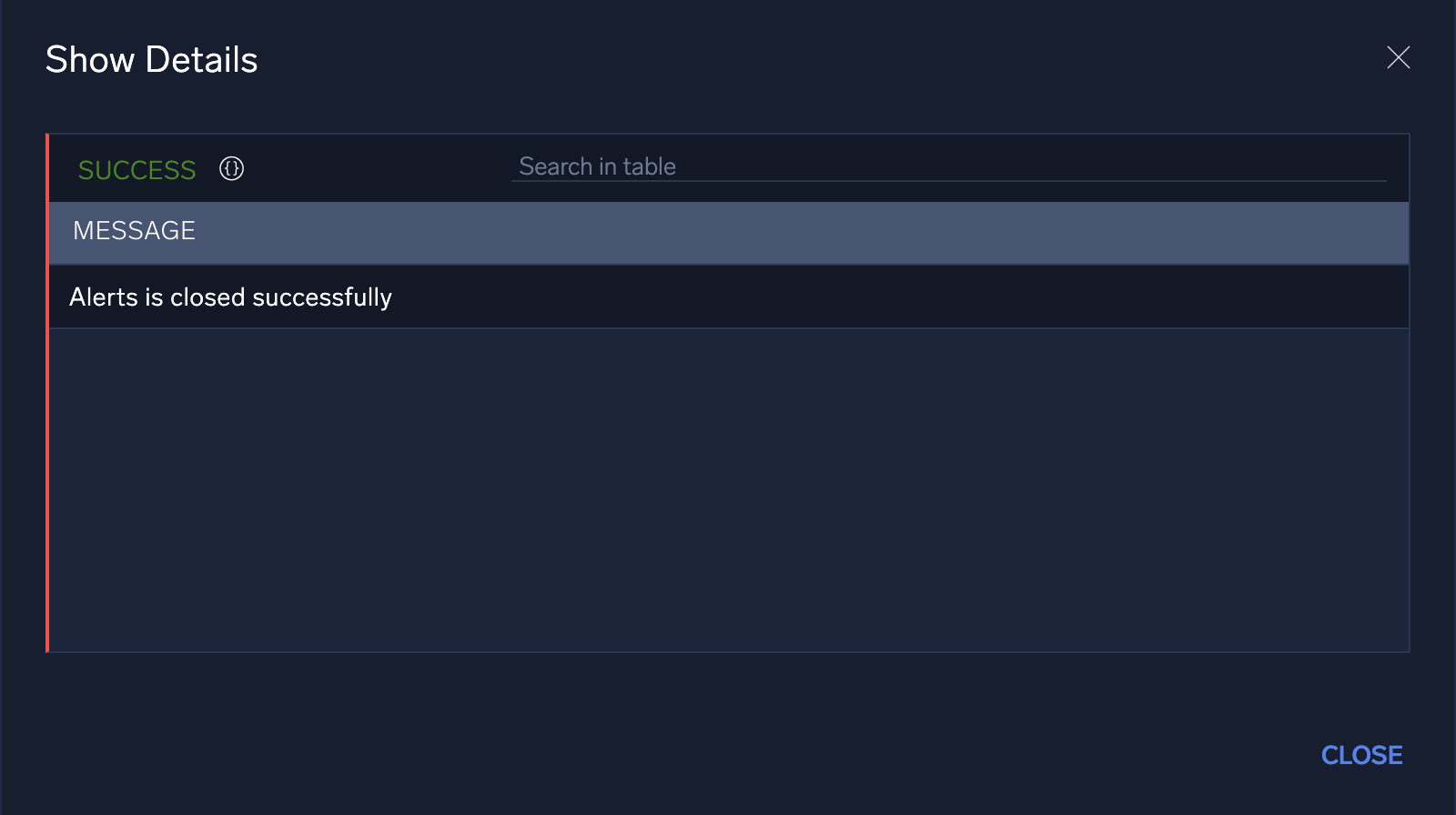 The execution result displays a message Alerts is closed successfully. This result means successful result of an execution.