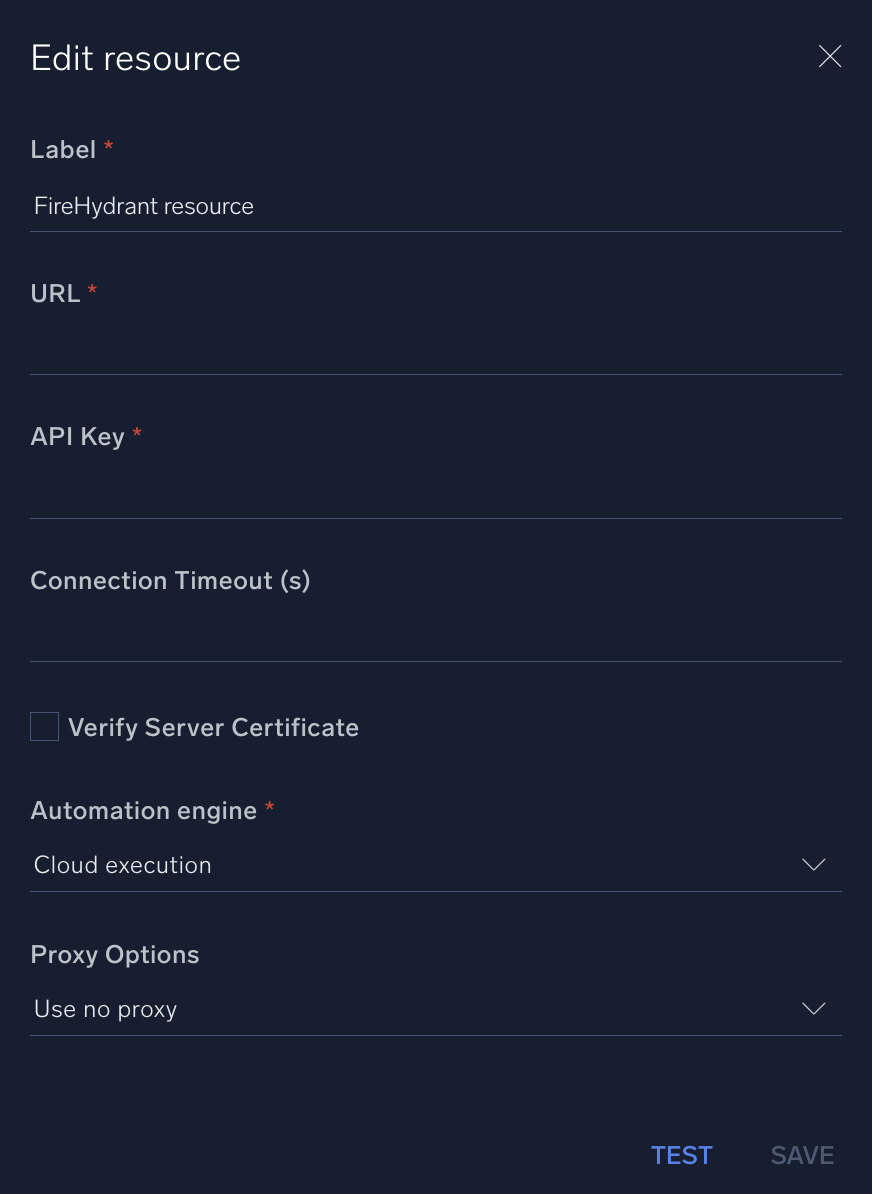 In the configuration dialog, enter information from the product you're integrating with. When done, click TEST to test the configuration, and click SAVE to save the configuration: