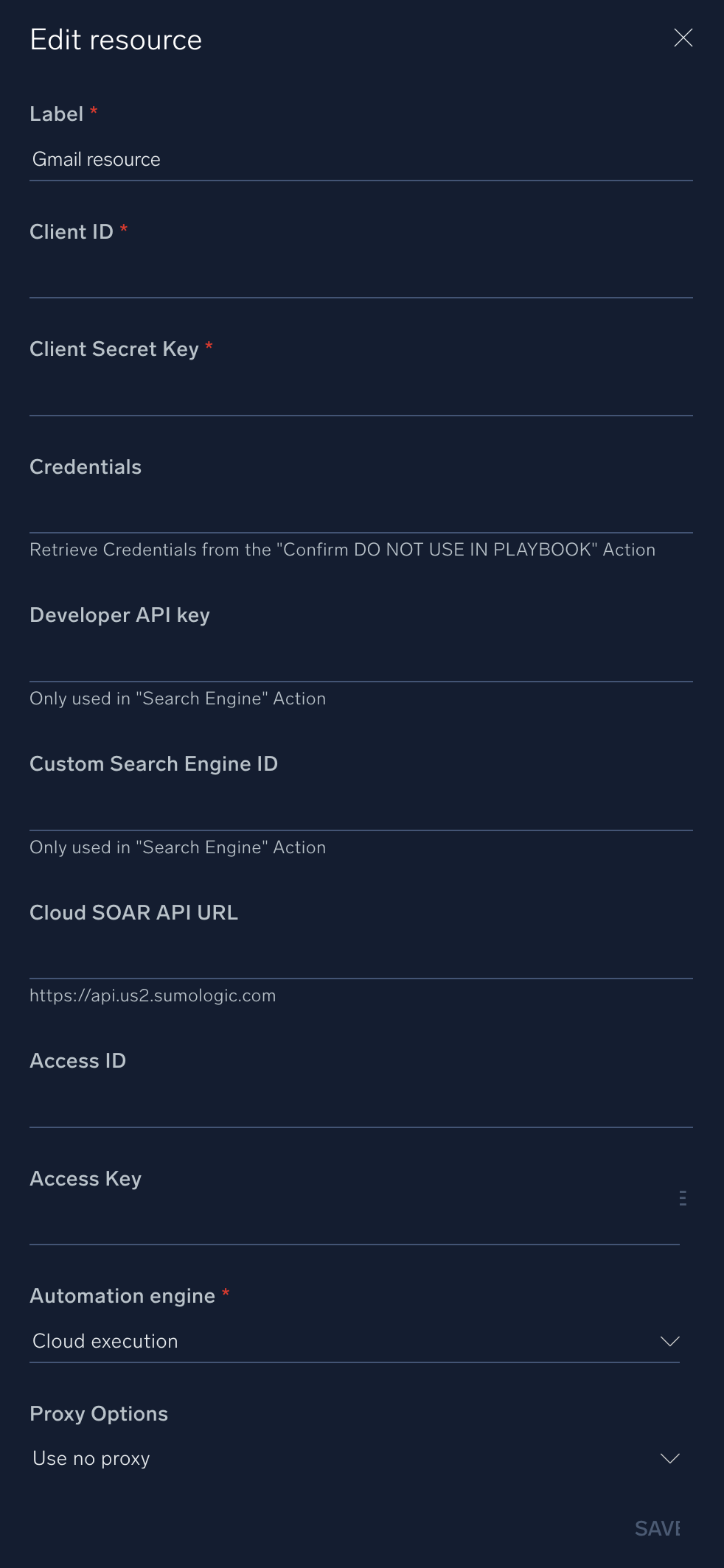 In Cloud SOAR, navigate to Settings > Integrations > Gmail, add a new Resource and provide the following inputs: