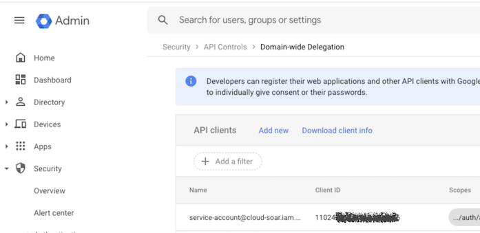 - Go to https://admin.google.com/ac/owl/domainwidedelegation to open the Domain-Wide delegation settings in the Google Admin portal.