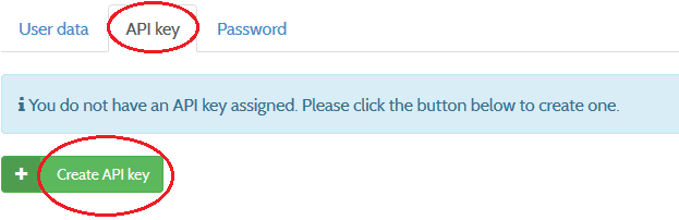 To obtain an API Key visit your profile page at the top right menu and navigate to the API key tab. Then press the 'Create API key' button as following: