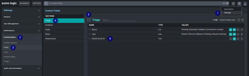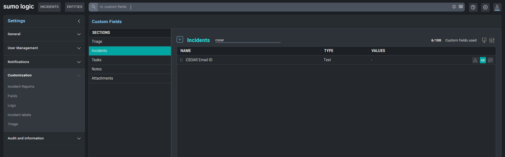 Now you have to create two Custom Fields, one for Incident and the other for Triage. We will need this custom Field in playbook and incoming events automation rule mapping.