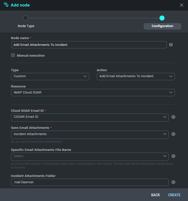 - Now let's expand the playbook by adding the ability to save attachments in the incident. Create a new node of type action and set the fields as you can see in the following picture.