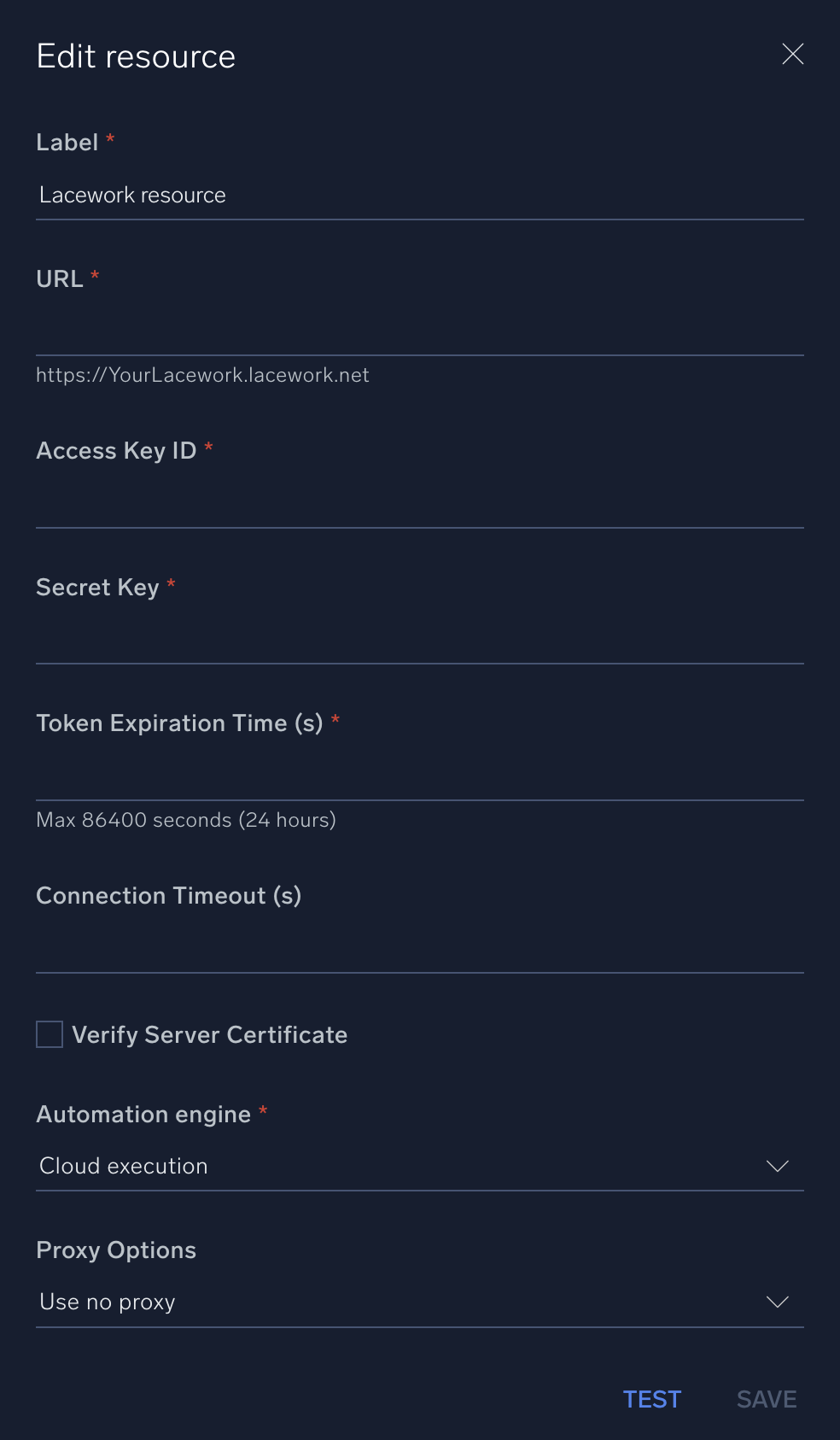 In the configuration dialog, enter information from the product you're integrating with. When done, click TEST to test the configuration, and click SAVE to save the configuration: