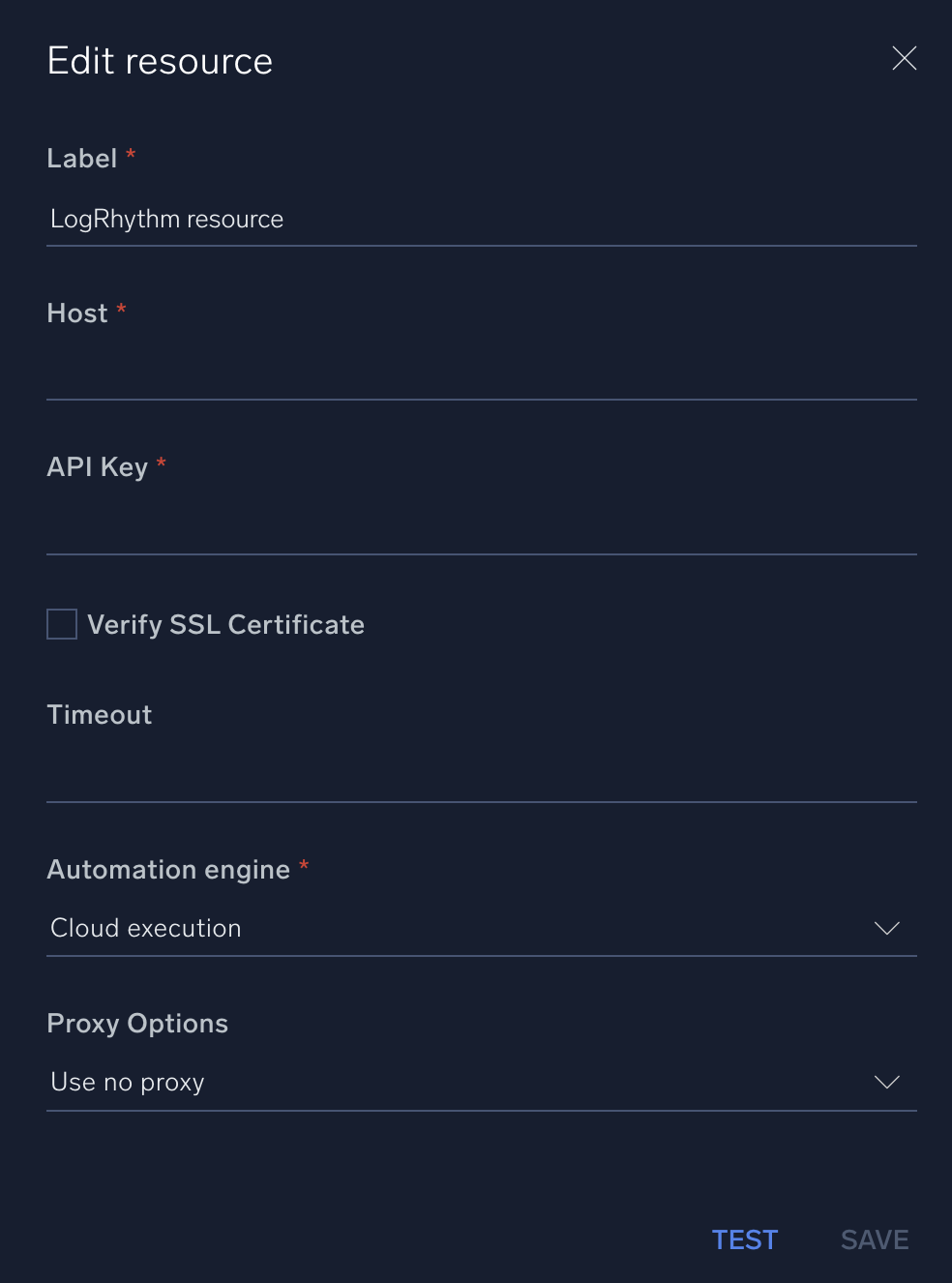 In the configuration dialog, enter information from the product you're integrating with. When done, click TEST to test the configuration, and click SAVE to save the configuration: