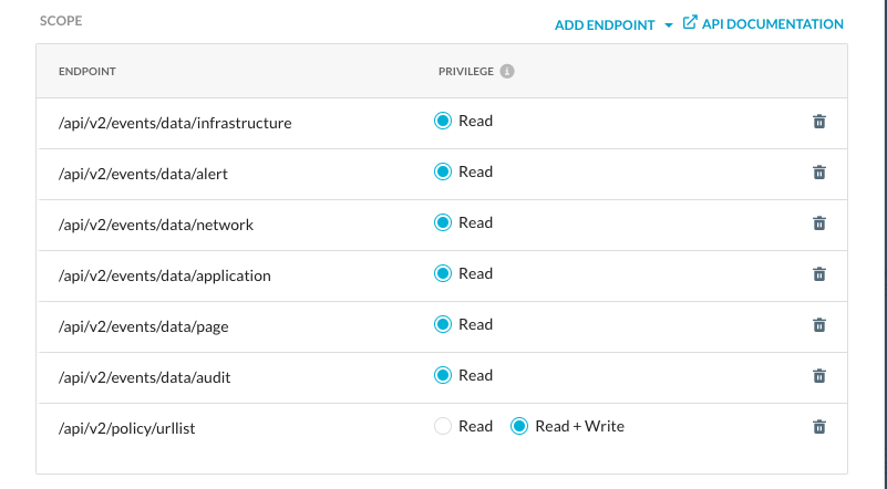 - Specify the privileges for each of the endpoints added. Read privileges include GET, and Read+Write privileges include GET, PUT, POST, PATCH, and DELETE. Endpoint privileges vary. Some endpoints, like alert and audit (and others) only have the Read privilege; whereas, the URL list/file endpoint only has Read+Write privileges. For this Integration following endpoints are required: