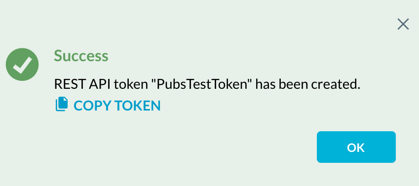 - A confirmation box opens showing whether the token creation was a success. If so, click Copy Token to save it for later use in your API requests.