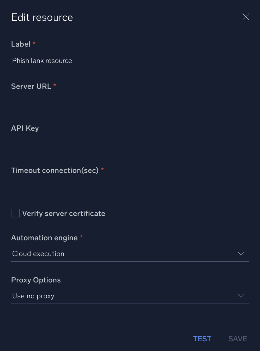 In the configuration dialog, enter information from the product you're integrating with. When done, click TEST to test the configuration, and click SAVE to save the configuration: