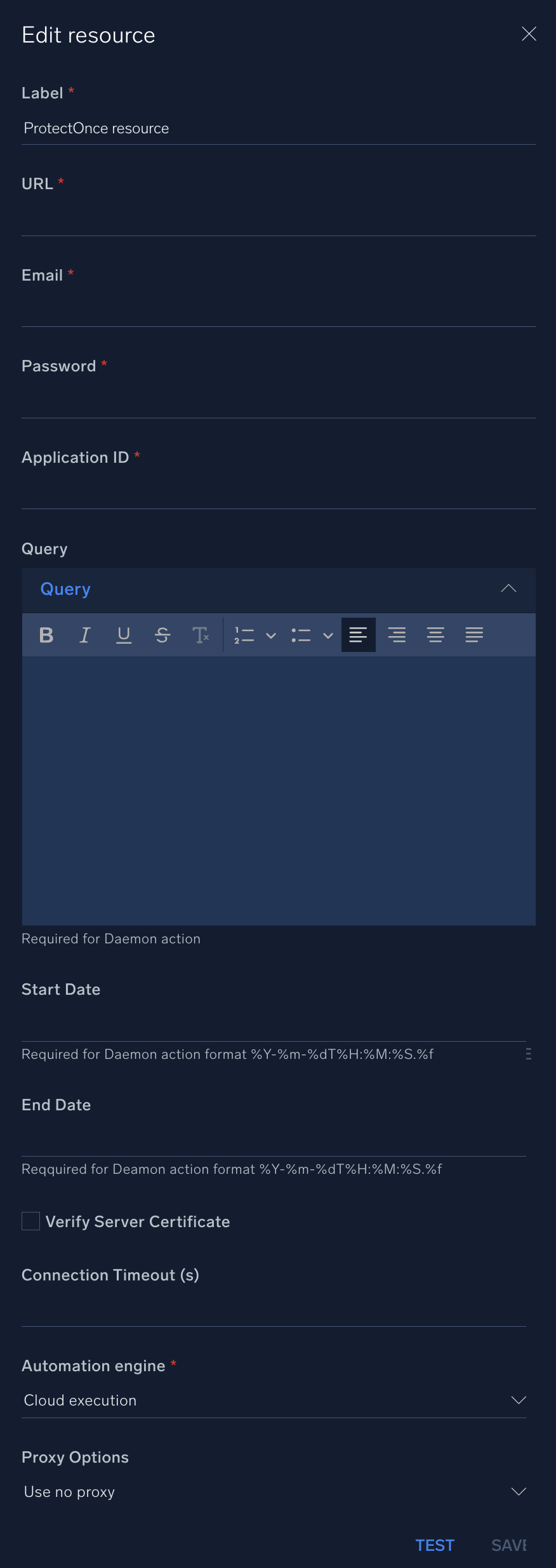 In the configuration dialog, enter information from the product you're integrating with. When done, click TEST to test the configuration, and click SAVE to save the configuration: