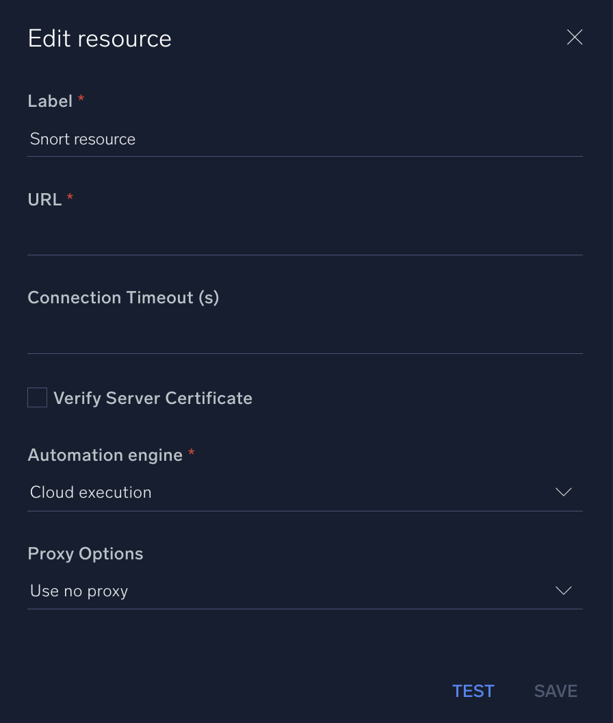 In the configuration dialog, enter information from the product you're integrating with. When done, click TEST to test the configuration, and click SAVE to save the configuration: