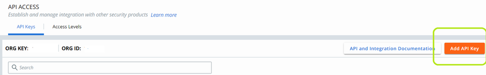 - Also you will see the ORG KEY from API Access, you need to copy it.