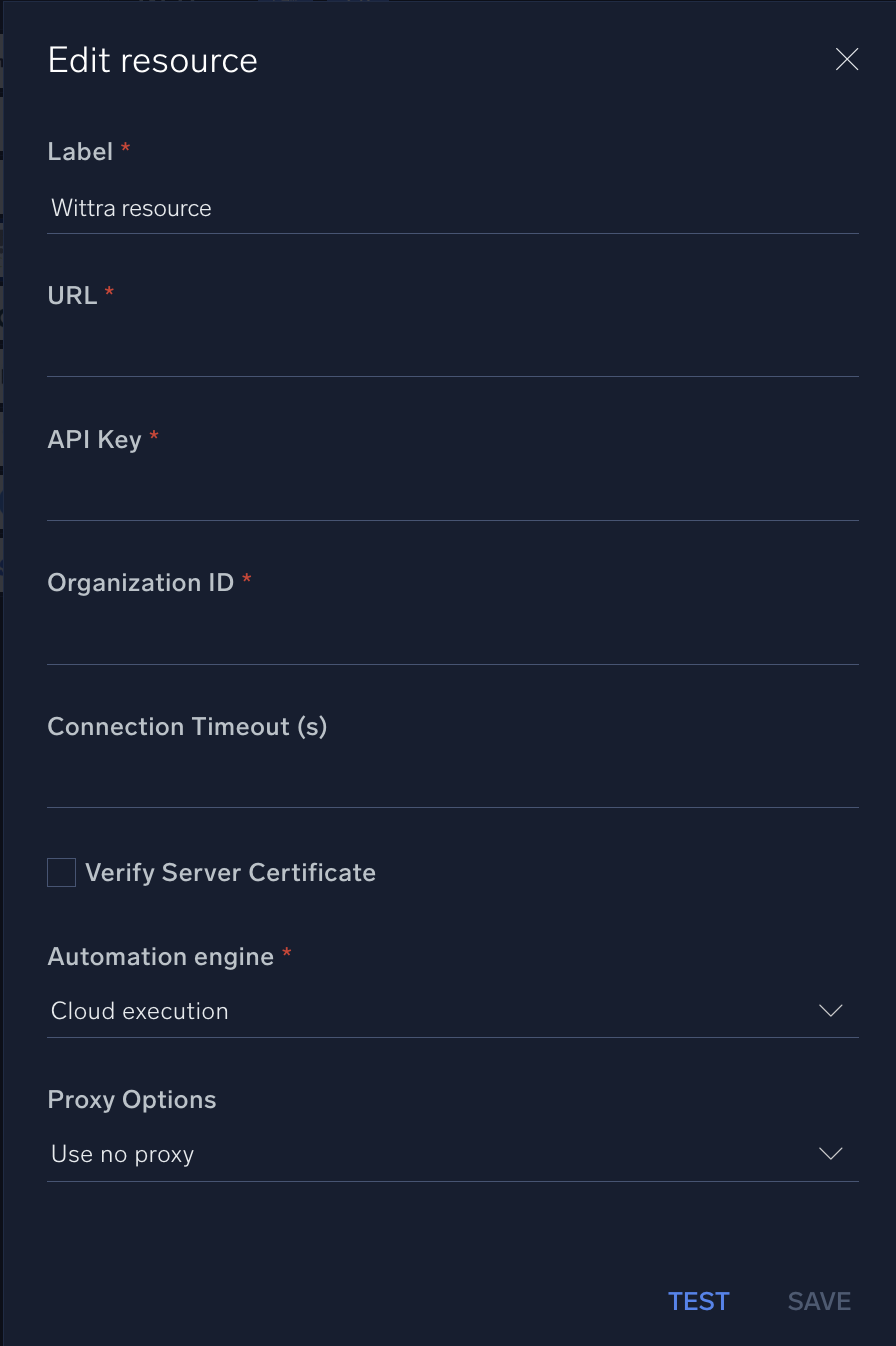 In the configuration dialog, enter information from the product you're integrating with. When done, click TEST to test the configuration, and click SAVE to save the configuration: