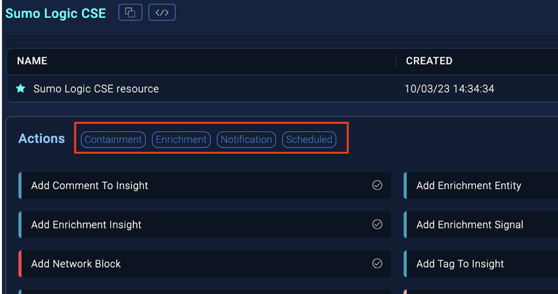- Go to the Integrations section and select the same integration. As you see in the image below, the Containment action type was added to the two types of actions that were there previously.