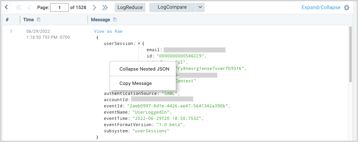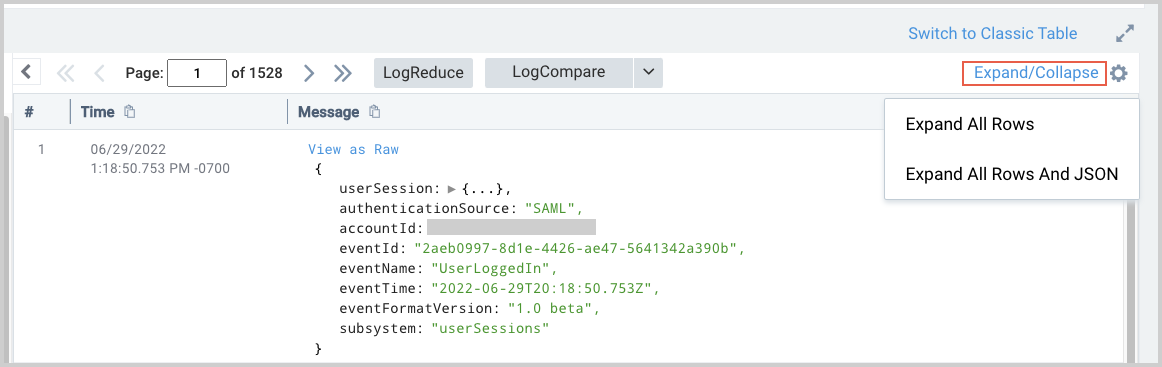 - Expand all Rows and JSON. Rows that show truncated messages are expanded to show complete messages, and nested JSON messages are expanded, as shown below.