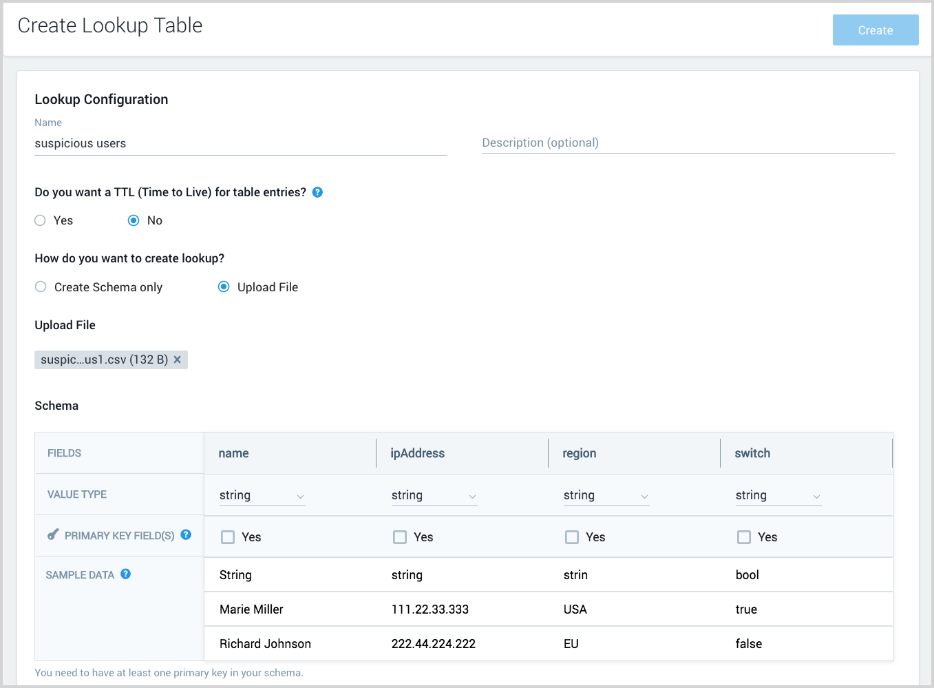 This section has instructions for creating a Lookup Table using the Sumo Logic UI. You can create the Lookup Table schema only, or create and populate the table by uploading a .csv file.