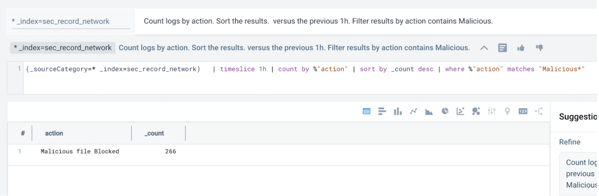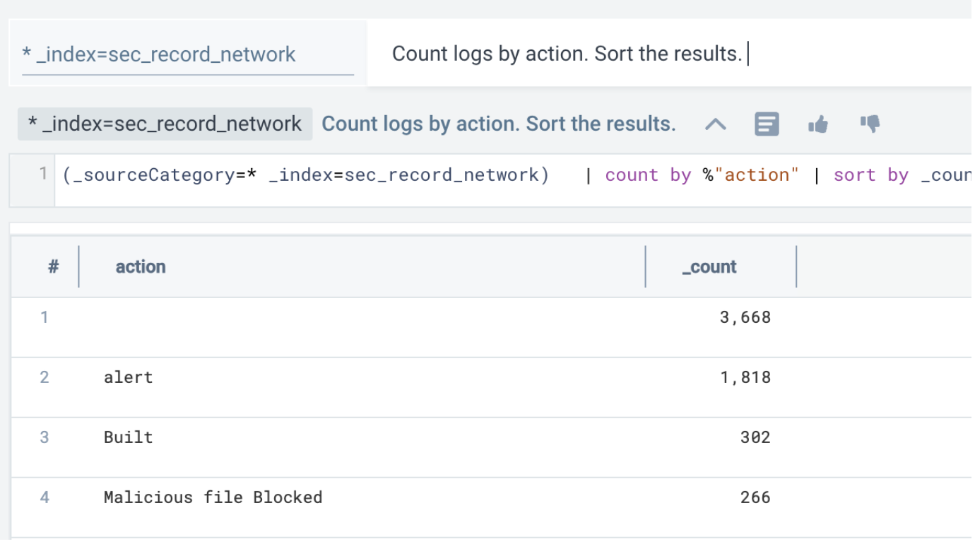 Filter results by action contains Maliciousto the query:Count logs by action. Sort the results. Filter results by action contains Malicious.