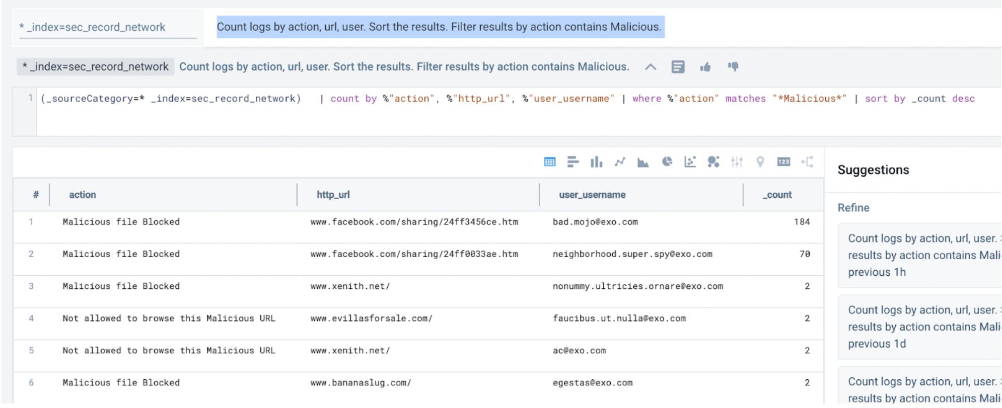 Maliciousdoesn't work, tryMalicious*. Sumo Logic is case sensitive. - Next, you look for URLs that pertain to the malicious action: