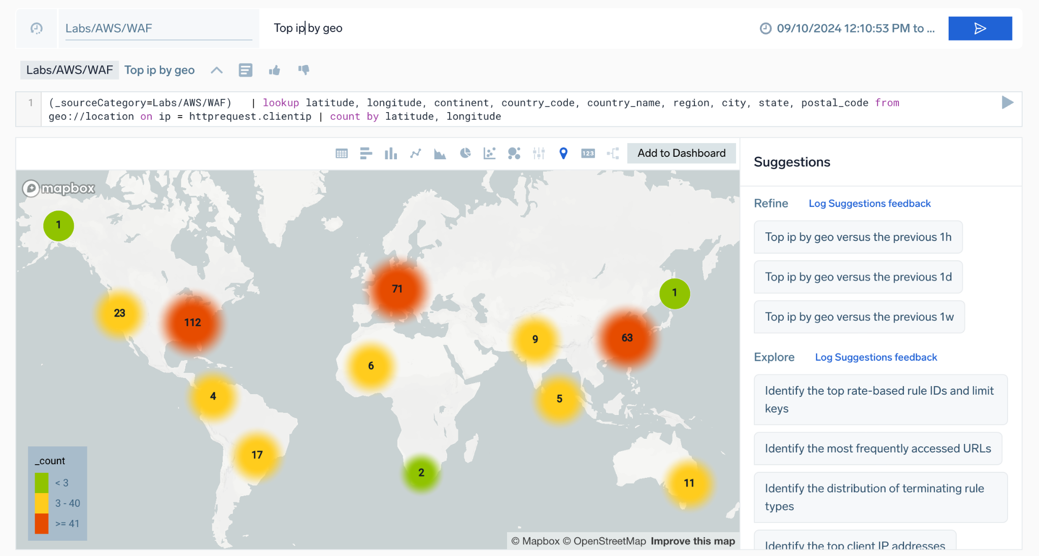 timesliceas a dimension. When timeslicing data, include the termtimein your query. For example:Count requests, every 1m, different code challenges and user used during login attempts by time. - Explore context-aware suggestions. Use prompts like