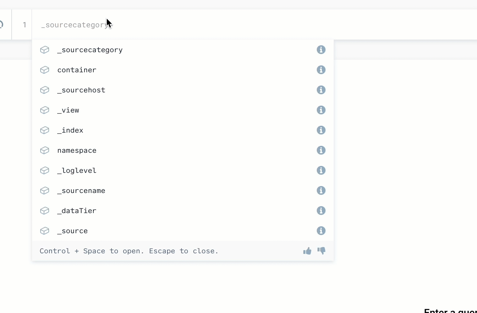 _sourceCategory=), you will be provided with relevant metadata keys options to help autocomplete your query. And once you select a particular key, it displays the available values for the selected metadata. This not only displays the built-in metadata fields but also discovers the custom fields configured in your system. - Clause Suggestions. When you start typing the operators, you will be provided with the entire clause to complete the remaining portion of the clause. Clause suggestions are currently restricted to the